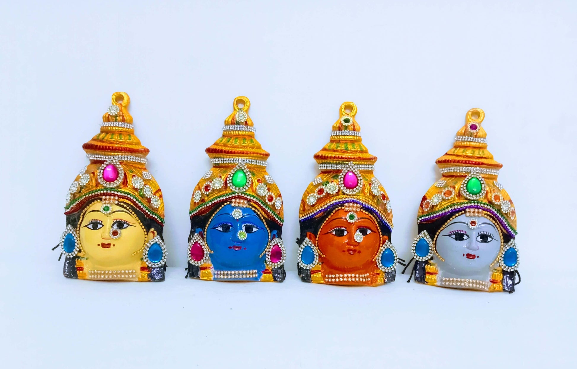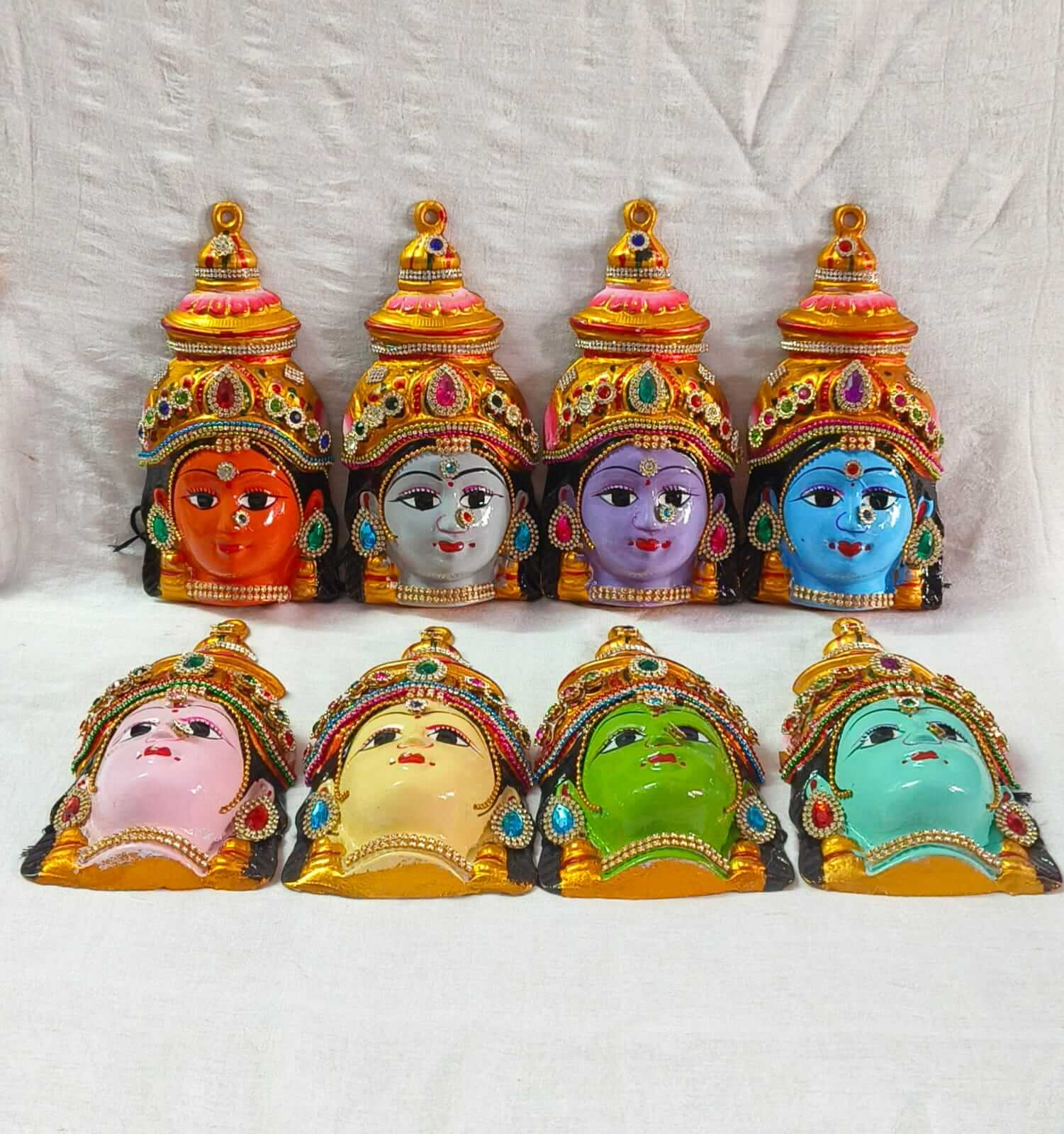 Goddess Lakshmi governs all the forms of wealth and auspiciousness.AshtaLakshmi are a group of eight manifestations of Devi Lakshmi, the Hindu goddess of wealth. She presides over eight sources of wealth. "Wealth" in the context of AshtaLakshmi means prosperity, fertility, good fortune or good luck, good health, knowledge, strength, progeny and power.This set has 8 decorated Lakshmi faces which is perfect for puja Varalakshmi Devi Fac for Varalakshmi Vrata Puja .and a great idea for gifting your loved and dear ones for weddings, anniversaries, festivals, birthdays etc.Order now !