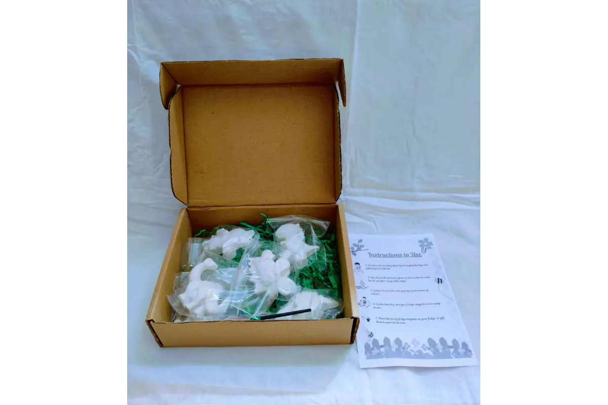 Set of 1: Contains 1 DIY Clay magnet, 3 paints & 1 brush Set of 2: Contains 2 DIY Clay magnets, 6 paints & 1 brush Set of 3: Contains 3 DIY Clay magnet, 6 paints & 1 brush Set of 6: Contains Clay magnets, with paints, brush, cup & seed paper Thank You card Material: Clay * Estimated delivery 5-7 days from order date based on stockNeed Assistance?