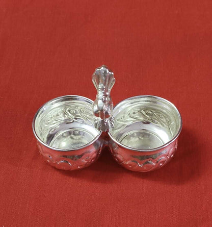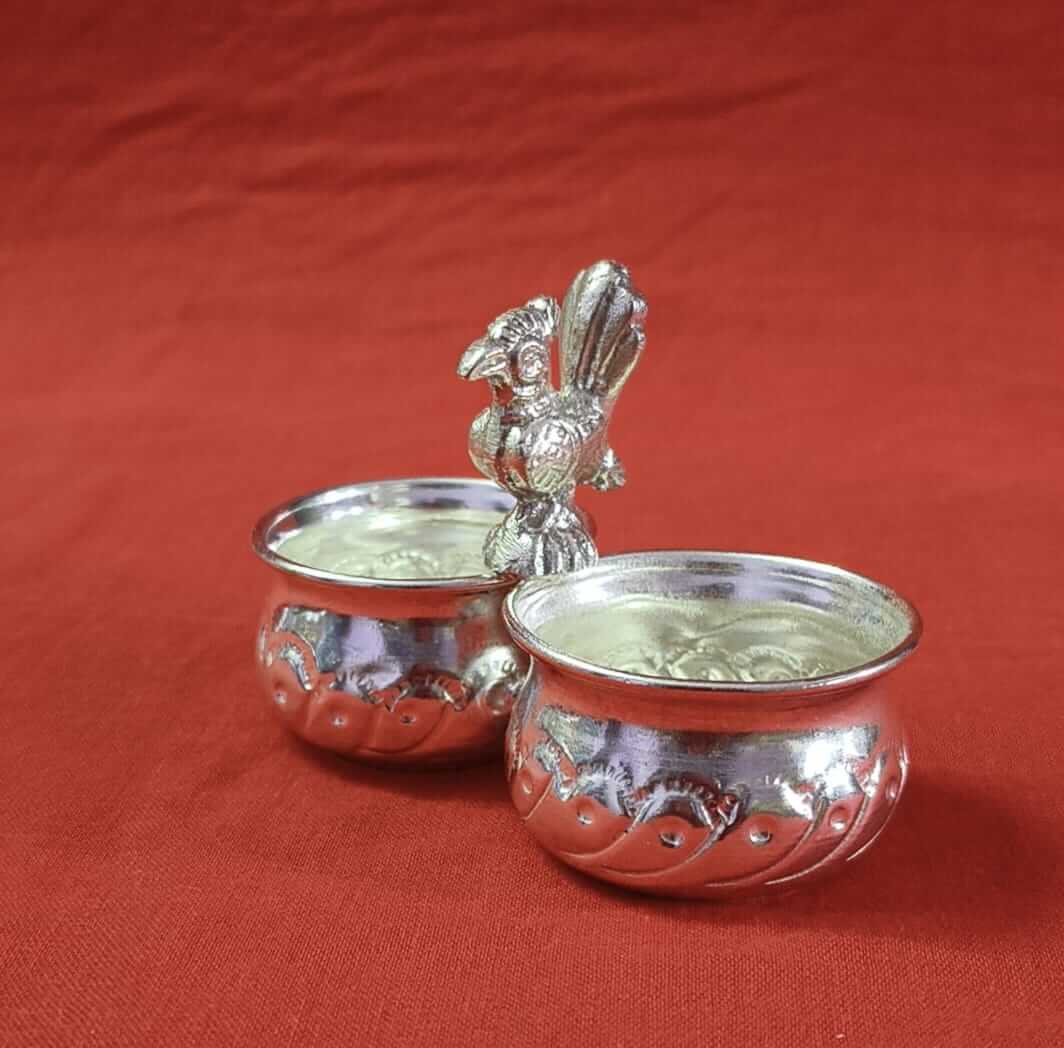 Shop this beautifully designed cup shape German Silver Peacock Kumkum Holder is best return gits for marriage, Seemantham, Housewarming function, other Poojas and Festivals. Explore now and Add to Cart!!