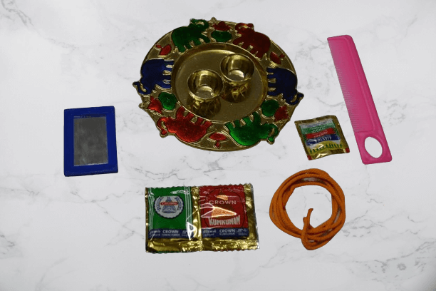 Items Include comb, mirror, thaali thread, kumkum turmeric pouch, betel nut (paaku), Haldi Kumkum Platter.