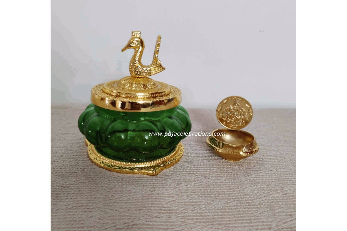 Size : Kubera Pot: 4 inches x 3 inches Diya: 1.5 inches x 2 inches Material: Brass Diya & Glass Pot with Metal lid and base. Pot made of toughened glass. Lakshmi padam inside Glass colours will vary Brass Kubera Diya Gold and kubera Lakshmi Pot green colour * Estimated delivery 5-20 days from order date based on stock