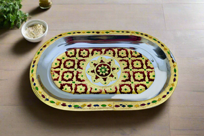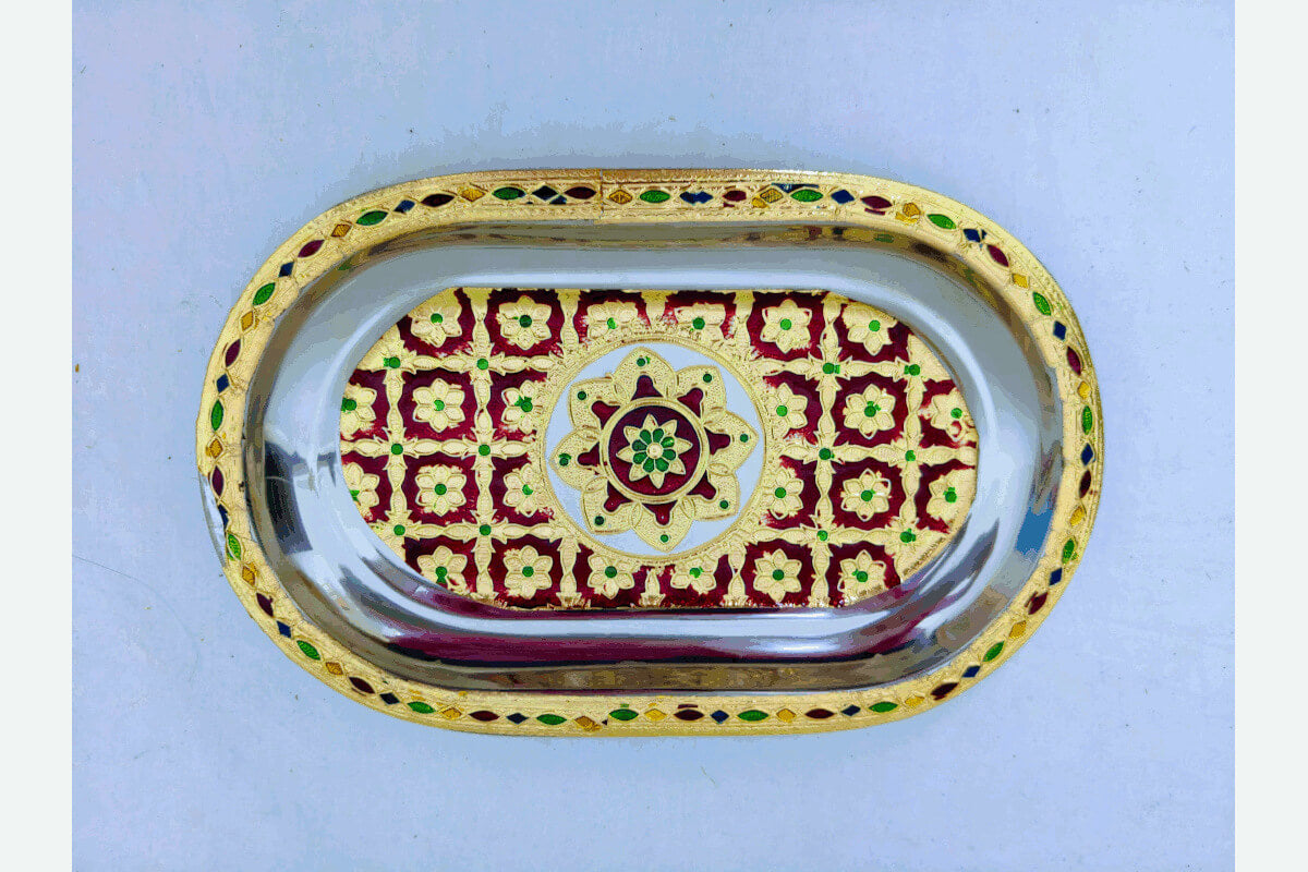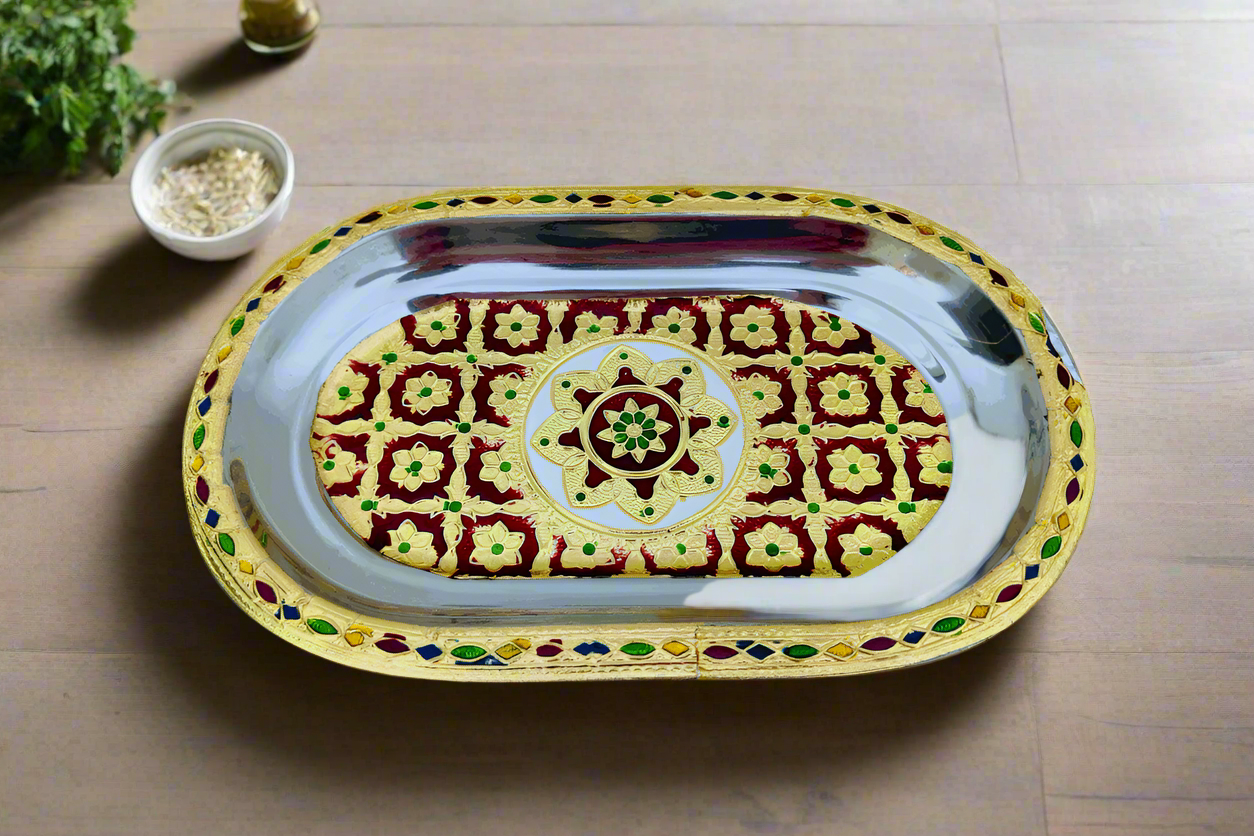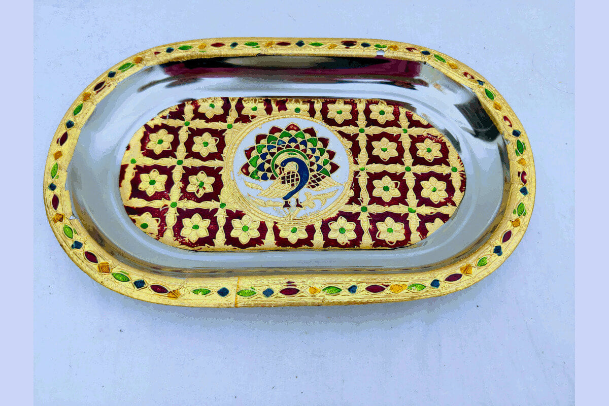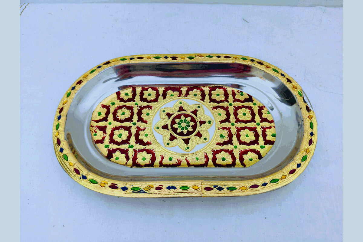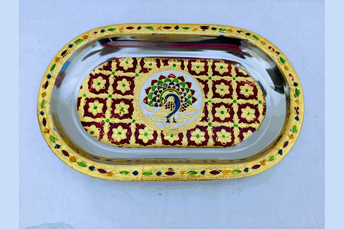 Welcome your guests with beautifully designed Return Gifts for for Housewarming Function like Meenakari Steel Tray Oval Small that brings good cheer to your special one! A perfect return gifts for Gruhapravesham and Seemantham. Explore now and Add to Cart!