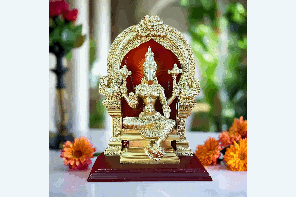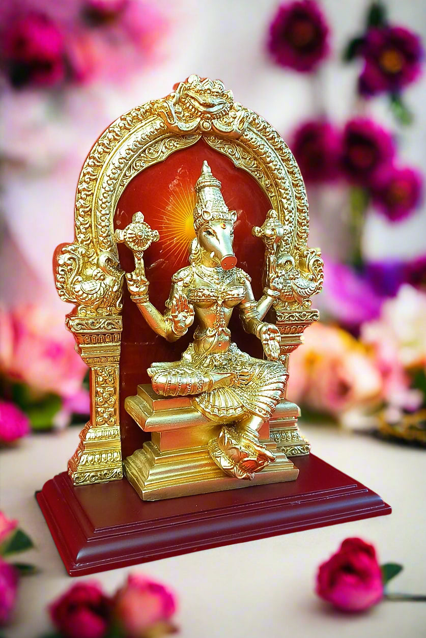 Enhance your religious practice with the Varahi Devi Amman Statue. This beautifully crafted statue features Varahi Amman holding a Prabhai, perfect for your puja rituals. Bring blessings and divine energy into your home with this stunning depiction of the goddess.